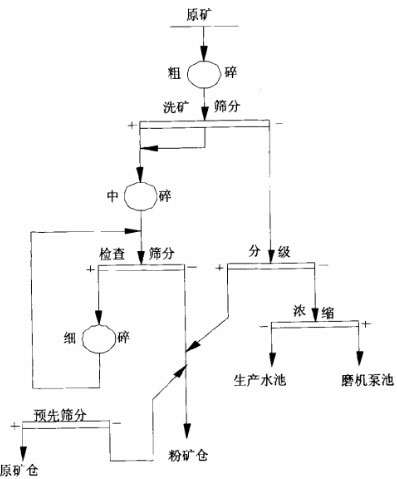 預(yù)先篩分一閉路破碎原則流程(如下圖)是在礦石進(jìn)入中碎作業(yè)之前,采用強(qiáng)力、效率高的雙層振動(dòng)篩將原礦分成若干粒級,分別進(jìn)入不同的作業(yè)進(jìn)行處理,從而減少礦石在流程中循環(huán),提高生產(chǎn)能力。