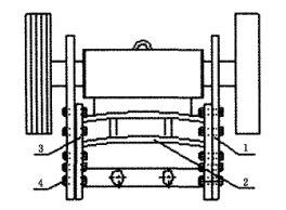 圖中,1為機架本體,2為筋板,3為兩塊支撐板,4為高強螺栓。機架本體的兩內(nèi)側面分別通過多個高強螺栓與對應的支撐板固定連接,這樣不僅加固了機架本體豎立面的強度,同時也增加了機架本體的自重,從而提高了機架本體抗沖擊的能力。