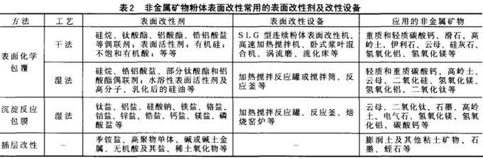 表面改性工藝包括干法和濕法;改性設(shè)備主要有連續(xù)式的粉體表面改性機(jī)、間歇式的加熱攪拌機(jī)、渦流磨、攪拌反應(yīng)罐和反應(yīng)釜等。表2所示為目前非金屬礦物粉體表面改性常用的表面改性劑及改性設(shè)備。