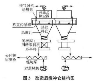 2、將煤管在進緩沖倉前分成兩路,分別對應兩個倉,并增設切換閥。