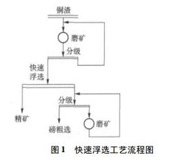 爐渣選礦大部分采用階磨階選的工藝流程,磨礦后的溢流先進快速浮選作業(yè),直接產出高品位的合格銅精礦,其工藝流程見圖1。爐渣的冷卻速度控制對爐渣中銅的嵌布粒度密切相關。有實驗結果表明,在緩冷條件下,有相當一部分硫化銅粗顆粒已經單體解離,因此及早回收這部分粒度大、品位高的銅礦物就顯得尤為重要。快速浮選不僅可提前回收品位高的銅礦物,還能提高總回收率和降低尾礦品位,同時也能大程度地降低磨礦成本。由于快速浮選精礦粒度相對較粗,有利于脫水過濾,精礦濾餅水分可降低1%~2%,銅總的回收率提高1.5%,尾礦品位能降低0.1%,經濟效益十分可觀。