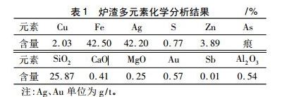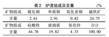 某爐渣多元素化學分析和礦物組成及含量分別見表1、表2。該銅爐渣中有用礦物主要有硫化銅、單質銅、氧化亞銅、磁鐵礦,此外還有銀和鋅的氧化物等,脈石礦物主要有硅酸鐵和玻璃質;玻璃質為爐渣的粘接相,膠結磁鐵礦、鐵橄欖石和銅礦物等。