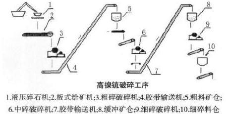 高鎳锍破碎工序是冶煉廠高锍車間的生產(chǎn)工序之一,生產(chǎn)工藝流程為:高鎳锍鑄塊——砸碎——粗碎——膠帶輸送——粗料倉——中、細碎——膠帶運輸——細料倉——磨礦,見下圖。