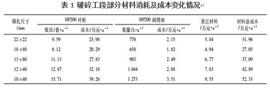 破碎系統(tǒng)材料消耗變化主要考慮的是HP200襯板、潤(rùn)滑油及其它易磨損設(shè)備和材料(部分運(yùn)輸皮帶等),其使用壽命與破碎工段開車時(shí)間有關(guān)。統(tǒng)計(jì)發(fā)現(xiàn),一套HP200襯板平均能使用304h,潤(rùn)滑油單位時(shí)間的消耗為0.267L/h,其它的易磨損設(shè)備和材料以20元/h根據(jù)開車時(shí)間計(jì)算。與開車時(shí)間不成正比關(guān)系的設(shè)備及材料消耗不計(jì)。由此可計(jì)算破碎工段材料成本的變化情況,見表1。其中襯板單價(jià)以2.5萬/套計(jì),潤(rùn)滑油按照27.6元/L計(jì)。