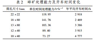 篩孔變小以后,碎礦工段單位時(shí)間的處理能力減少,處理等量原礦的情況下,開車時(shí)間延長(zhǎng)。表2列出了碎礦工段單位時(shí)間處理能力及年處理35萬t原礦的情況下碎礦所需的開車時(shí)間變化情況。