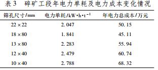 減小篩孔尺寸后,破碎工段電力單耗總體上呈上升的趨勢(shì),根據(jù)電力單耗的變化,計(jì)算出了每年處理35萬t原礦破碎所需的電力成本,見表3。