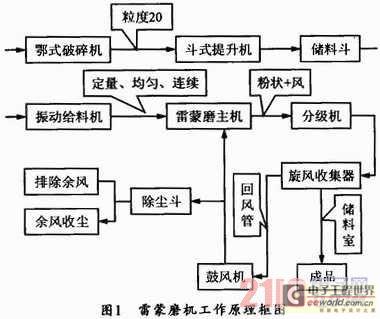 雷蒙磨機(jī)由主機(jī)、分級(jí)機(jī)、鼓風(fēng)機(jī)、斗式提升機(jī)、電磁振動(dòng)給料機(jī)、儲(chǔ)料斗、鄂式破碎機(jī)、管道系統(tǒng)、電控柜等組成。工作原理框圖如圖1所示。