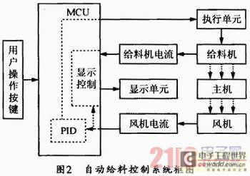 要實(shí)現(xiàn)雷蒙磨機(jī)自動(dòng)給料,首先要完成的工作就是實(shí)時(shí)檢測(cè)磨機(jī)的工作負(fù)荷情況,根據(jù)負(fù)荷的情況通過(guò)微機(jī)處理分析控制給料機(jī)實(shí)現(xiàn)自動(dòng)增加或減少給料??梢酝ㄟ^(guò)雷蒙磨機(jī)的主機(jī)電流或者風(fēng)機(jī)電流來(lái)反應(yīng)磨機(jī)的負(fù)荷情況,經(jīng)過(guò)實(shí)際考察所得:①主機(jī)電流的變換范圍很大,并且在工作點(diǎn)處的電流抖動(dòng)的很大,無(wú)法很準(zhǔn)確的反應(yīng)磨機(jī)的工作負(fù)荷情況。②風(fēng)機(jī)電流變換范圍也比較大,但是當(dāng)時(shí)風(fēng)機(jī)電流當(dāng)主機(jī)負(fù)荷化時(shí)反應(yīng)很靈敏,一旦主機(jī)超負(fù)荷,風(fēng)機(jī)電流就很快的降下來(lái)(注:風(fēng)機(jī)電流隨著負(fù)荷的情況向相反方向變化)。因此為了更準(zhǔn)確實(shí)現(xiàn)自動(dòng)給料,本設(shè)計(jì)采用風(fēng)機(jī)電流作為輸入信號(hào),運(yùn)用現(xiàn)在比較成熟的PID控制算法,驅(qū)動(dòng)給料機(jī),構(gòu)成了一個(gè)完整的閉環(huán)系統(tǒng),如圖2所示。