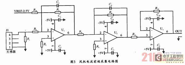 雷蒙機(jī)風(fēng)機(jī)電流動(dòng)態(tài)范圍為0-150A,風(fēng)機(jī)的變化間接的反應(yīng)了主機(jī)負(fù)荷情況。要保證準(zhǔn)確的反應(yīng)主機(jī)的負(fù)荷情況,對(duì)于風(fēng)機(jī)電流的采樣要保證采樣電路可以識(shí)別2A的電流,因此設(shè)計(jì)的風(fēng)機(jī)電流既要保證大的電流動(dòng)態(tài)范圍同時(shí)由于保證較高的檢測(cè)靈敏度。鑒于以上要求采用交流采樣方法,取風(fēng)機(jī)電流2次線(xiàn)圈的電流(0-5A)再經(jīng)緊密電流互感器取樣電流值。為了方便單片機(jī)實(shí)現(xiàn)電流的采集將電流互感器的輸出雙極性交流信號(hào)加一定的偏置,然后由AD采集到單片機(jī)內(nèi)部。為了檢測(cè)電流的有效值,本設(shè)計(jì)在單片機(jī)內(nèi)部實(shí)現(xiàn)一個(gè)軟件的峰值保值器,采集大于一個(gè)周期的信號(hào),在一次采集后找出最大值,在將最大值換算成有效值,最后按照一定比例轉(zhuǎn)換成風(fēng)機(jī)電流值。前端采集電路如圖3所示。該采集方案在實(shí)際的產(chǎn)品上測(cè)試驗(yàn)證檢測(cè)可以識(shí)別1A的電流,滿(mǎn)足設(shè)計(jì)要求。