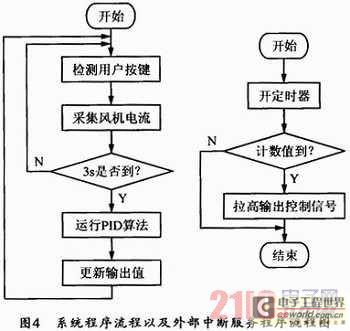 軟件部分包括AD采集控制、輸出控制單元、顯示單元、用戶(hù)按鍵控制單元和PID控制算法??刂破鬈浖\(yùn)行流程圖如圖4所示,上電后程序檢測(cè)按鍵有無(wú)按下,用戶(hù)可以設(shè)定工作電流值,然后采集一次電流值,當(dāng)PID控制時(shí)間到后執(zhí)行PID算法,更新輸出值。外部中斷服務(wù)程序主要是用于檢測(cè)交流過(guò)零點(diǎn),實(shí)現(xiàn)調(diào)相功能。