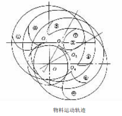 筒體沿圓形軌跡向前平動一周,物料和介質(zhì)也在筒體內(nèi)的外側(cè)緊貼內(nèi)壁被迫錯動旋轉(zhuǎn)一周。若筒體沿圓形軌跡以360r/min高速平動旋轉(zhuǎn),則物料和介質(zhì)沿筒體內(nèi)壁每分鐘也被迫錯動高速旋轉(zhuǎn)360次。物料和介質(zhì)在筒體內(nèi)的運動軌跡如下圖所示。