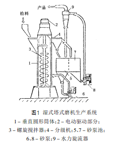濕式塔式磨機(jī)閉路生產(chǎn)系統(tǒng)如下圖1所示。垂直圓形筒體內(nèi)的主(豎)軸上裝有螺旋攪拌葉片(或攪拌器),由電動(dòng)機(jī)的驅(qū)動(dòng)裝置帶動(dòng)它作快速旋轉(zhuǎn)運(yùn)動(dòng),以此強(qiáng)迫攪拌筒體內(nèi)的研磨介質(zhì)和被磨物料強(qiáng)烈旋轉(zhuǎn),使物料受到研磨作用而粉碎。粉碎產(chǎn)品由磨機(jī)流入分級(jí)機(jī),再經(jīng)水力旋流器進(jìn)行分級(jí),溢流即為磨礦產(chǎn)品,粗粒通過(guò)管道返回磨機(jī)再磨。塔式磨機(jī)的基本磨碎作用是磨剝而沒(méi)有沖擊,因此其給料粒度一般小于3mm,不應(yīng)大于5mm,否則設(shè)備處理能力和效率均下降。