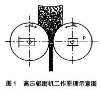以冶金球團行業(yè)為例,說明高壓輥磨機的工作原理。高壓輥磨機工作時, 含有一定水分的鐵精粉原料經(jīng)進料裝置并靠料柱重力產(chǎn)生的料壓,垂直給入輥子之間的擠壓區(qū)域,并被擠壓輥連續(xù)地帶入輥間,物料除了與輥面接觸的顆粒受到輥面直接壓力外,兩個相向旋轉的輥子同時也將粉碎腔內的物料壓實,致使粒群中的顆粒承受多點的壓力作用,導致壓實區(qū)的物料容重接近物料真密度,顆粒在粒群中的相互擠壓下遭到粉碎,最終產(chǎn)品呈餅狀排出機外,再進入強力混合機與添加物(膨潤土)進行充分混合后進行造球。