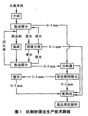 目前國內(nèi)機(jī)制砂產(chǎn)品質(zhì)量問題比較多,主要表現(xiàn)在:級配不合理,細(xì)度模數(shù)偏高;含泥量和泥塊含量超標(biāo);顆粒粒形差;粗砂級配保水能力差。隨著優(yōu)質(zhì)天然砂資源逐步枯竭,天然細(xì)砂產(chǎn)品逐漸增多,由于一般機(jī)制砂產(chǎn)品以粗砂為主,因此,利用天然細(xì)砂與機(jī)制粗砂混合,可以生產(chǎn)出符合建筑工程要求的建筑用砂產(chǎn)品,其中為減少天然細(xì)砂用量,可考慮對部分粗砂進(jìn)行細(xì)磨。具體的生產(chǎn)工藝方案機(jī)制砂生產(chǎn)主要有干法和濕法工藝,相應(yīng)工藝如圖1、2所示,其中: