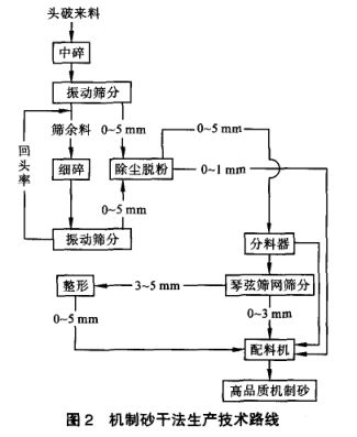 (2)一般中碎和細(xì)碎工藝所產(chǎn)普通0-5mm機(jī)制砂細(xì)度模數(shù)偏高、針片狀較多,借助琴弦篩篩分出3~5mm石屑并經(jīng)立軸整形工藝進(jìn)一步破碎和整形制得0~5mm機(jī)制砂,改善了粒形、級配和細(xì)度模數(shù)。